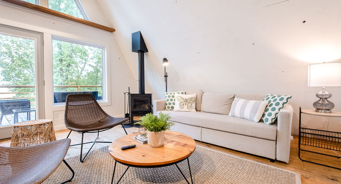Explore the Back Porch Cabin with modern decor and breathtaking views of the Sylamore Creek Valley.